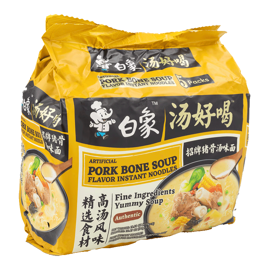 Pork Bone Flavor Instant Noodle Soup, 113g*5*6/ctn, CTN N.W.: 3.39kg, 20GP: 1050ctns, 40HC: 2550ctns. -